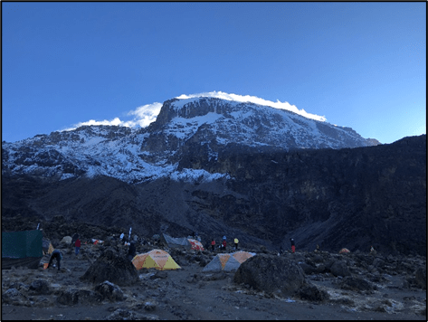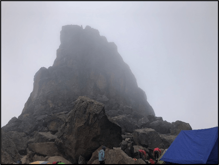 The day hike to Barafu Camp was the shortest of all the days, but not necessarily the easiest. In 1.1 miles, we gained over 2,000 feet in elevation, putting us at 15,331 feet elevation the final night before the summit. Everything seemed harder to do at this elevation due to the thin air; just getting in and out of the tent took some effort. The clouds rolled in surrounding us in the afternoon, and as we ate dinner around 6:00, our guides came into our mess hall tent with a significantly more serious tone than in previous nights. They explained what the schedule would look like for the next day, and emphasized the importance of turning back should any kind of emergency occur. The guides depended on their clients’ summitting success for high ratings, but the last thing they wanted was a client who had to be evacuated off the mountain. We took one last oxygen test, and as I got into the tent I noted how much windier it was than in any of the previous camps. I had no idea what was in store the next few hours.