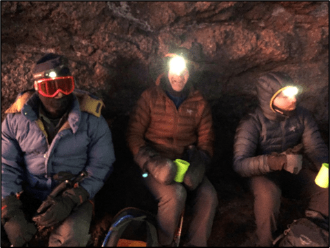 We woke up at the scheduled time of 12 AM to make the final ascent. For some reason, I immediately thought about life back home, where it was 2:00 PM on a Sunday: everyone enjoying their weekend, relaxing, maybe watching football, while I was up at midnight, in Tanzania, about to hike into sub-0 temperatures with more wind chill than I’d ever experienced. Headlamps on, we departed, and honestly I didn’t feel too cold at first (I was wearing three layers, all warm clothes with one down jacket, along with thick gloves and a balaclava). Every few minutes I’d look up and see small twinkling lights produced from other headlamps. The stars were out, but there was no moonlight to see even the outline of the mountain. We were hiking blindly, depending entirely on our guides to get us to the summit. Around 12:45 AM, the wind started really picking up, and it got colder. Much colder. Not like, “Wow I wish I had another jacket” cold, but like “I don’t think I can keep walking” cold. I started shivering and stuffed my gloved hands in my jacket pockets while extending my lower teeth out so I could breathe warm air into my face. My nose started running like crazy and for the first time during the trip I started having doubts on whether I could do this. To make matters worse, we saw several hikers being escorted back down the narrow pathway, their guides holding them carefully making sure they didn’t collapse or pass out. Candy wrappers and other trash scattered the trail, as littering was no longer a concern for anyone trying to survive the next step (I saw this because I was looking down a lot).