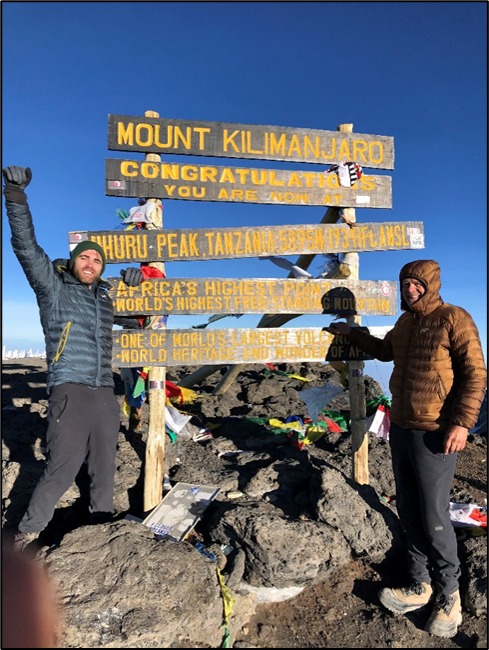 At 2:15 AM, we stopped for a water break. I overheard Larry ask one of our guides, “How far are we from Stella Point?” to which our guide responded “You don’t want to know. Ask me around 5 AM.” Stella Point was located on the crest of the volcano’s caldera; once you made it there, it was only about 30 more minutes to the summit. My mind continued to race for motivational thoughts, anything to keep my feet going. As a runner, this was something I was familiar with; it’s always been so fascinating to me how mental a lot of things are. (As a big Lord of the Rings nerd, I of course thought of the Mt. Doom scene where Sam and Frodo are struggling to continue. I tried channeling Sam’s motivational speech, and then realized I just wanted him to carry me up this mountain like he did for Frodo. LOL). We continued onward and finally reached Stella Point at 18,638 feet, where we saw the vastness of the volcano’s caldera. At this point we started seeing rays of sunlight come up over the horizon, and since Stella Point is basically 30 minutes from the summit, we felt relief in knowing we didn’t have much further to go. At exactly 7:00 AM, we reached the summit of Kilimanjaro, and with the sun now up in full, it didn’t feel quite as cold, but it could’ve been the success of making it that warmed the air. As I looked around I spotted Mt. Meru – it looked like a small hill from up there! It was surreal and something I’ll never forget. We had reached “the roof of Africa” as our guides told us, and it’ll be a lasting memory I’ll have with my dad.