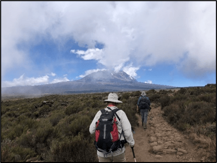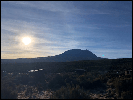 After a hearty breakfast made by our cook, we continued our trek upwards, making our way out of the rainforest and getting a glimpse of the vast flatlands below us. We were now in a dusty terrain with thick brush surrounding us. It reminded me of the hiking terrain in San Diego and helped me feel not so far away. While we still couldn’t see Kilimanjaro, our guides pointed out another mountain that came into view behind us – Mt. Meru, the 5th tallest mountain in Africa about 43 miles west of Kilimanjaro. Even in the distance it towered above us, and I wondered what Kilimanjaro would look like in comparison. With no trees to block the wind anymore, we felt (and saw) the effects as dirt wafted around us and the temperature dropped quite dramatically. Then finally, during our last mile of the day, Kilimanjaro came into view. It wasn’t a menacing mountain, as most volcanoes are more rounded and broader than sharp and jagged. As I looked upon it, I reminded myself this was one of the seven summits, the tallest mountain in Africa, the reason I had traveled nearly 10,000 miles from home, and I was excited to see what challenges it had in store for us.