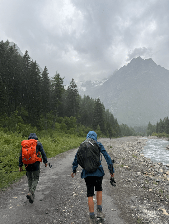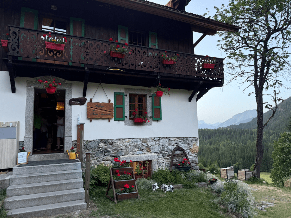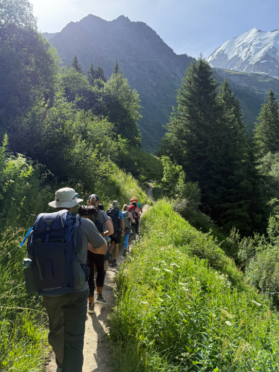 Our group of 12 departed from the cozy town of Chamonix (France) just after 7am, not knowing all the ominous twists and turns the first day of this mountainous trek would bring. From the valley floor we could look up and see not just the French Alps, but Mont Blanc itself, towering above us at 15,766 feet (comparative to our elevation at 3,400 feet). Getting to the trailhead of our 8-day trek involved a short train ride to the gondola station, where we ascended up the Alps in a gondola by roughly 1,000 feet elevation. Excitement pulsed through the group as we listened to our guide, Jean-Pierre, explain the itinerary for the day. After a few moments taking in the scenery, we set out together on a single-track trail winding through tall pine trees, hugging the side of the mountain range we’d be circling around for just over a week. However, little did we know that morning’s meeting would be the only time we’d be together the rest of the day.